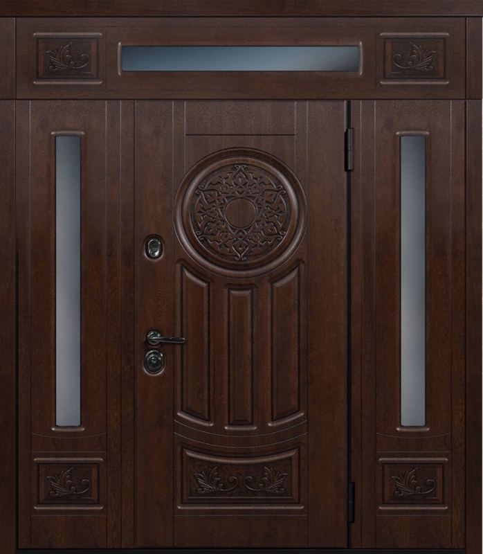 Эта нестандартная парадная дверь с фрамугой №6 — отличный выбор для тех, кто ценит элегантность и долговечность. Внешняя и внутренняя отделка из МДФ придает дверям стильный и современный вид, а также защиту от механических повреждений. МДФ устойчива к царапинам и вмятинам, что делает дверь идеальной для долгосрочной эксплуатации. Каркас из профильной трубы 50х25 мм и лист металла толщиной 2 мм обеспечивают прочность и надежность, а ребра жесткости из профильных труб гарантируют дополнительную устойчивость. В двери установлены блокираторы, два контура уплотнителей из резины, что повышает звуко- и теплоизоляцию. Замки от известных производителей, таких как Просам и Мосрентген, обеспечат надежную защиту. Возможность комбинировать отделку, добавлять зеркало, стеклопакет или кованые элементы позволяет легко адаптировать дверь под любые предпочтения. Нестандартная парадная дверь с фрамугой №6 от производителя: быстрое изготовление и монтаж в Гжели, индивидуальные размеры, широкий выбор материалов и фурнитуры, официальная гарантия до 10 лет.