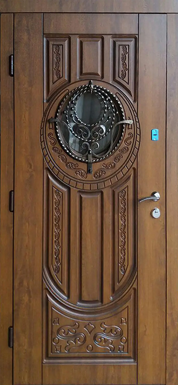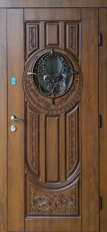 Владельцы коттеджей ценят входные конструкции, которые одинаково подчеркивают статус и защищают от любых внешних факторов. Здесь удачно сочетаются прочный металл и массив дуба, придающий поверхности солидность и благородство. Натуральное дерево сохраняет цвет и текстуру долгие годы, устойчиво к механическим повреждениям и перепадам температуры. Внутри конструкции скрыт стальной каркас толщиной 1,5 мм с ребрами жесткости и противосъёмными блокираторами, что делает полотно практически неприступным. Особое преимущество — терморазрыв коробки и полотна, благодаря которому дверь не промерзает даже в сильные морозы и сохраняет тепло в доме. Именно на этом контрасте надежности и эстетики выделяется железная дверь со стеклом и ковкой №21, украшенная изящными декоративными элементами. Три контура магнитного уплотнения обеспечивают герметичность, а система замков Kale Kilit повышает уровень безопасности, при этом конструкция допускает установку современных умных решений и дополнительных декоративных опций. Железная дверь со стеклом и ковкой №21 от производителя: быстрое изготовление и монтаж в Гжели, индивидуальные размеры, широкий выбор материалов и фурнитуры, официальная гарантия до 10 лет.