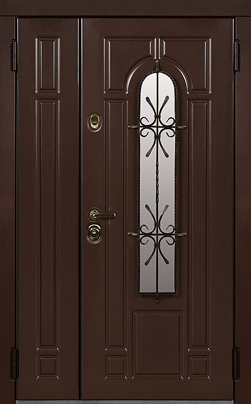 Эта металлическая двухстворчатая дверь с арочным стеклопакетом №15 представляет собой идеальный баланс между эстетикой и прочностью. Арочное стекло добавляет в её дизайн утончённость, а ковка в декоре придаёт изысканный, но в то же время крепкий и надёжный вид. Плита МДФ, используемая как для внешней, так и для внутренней отделки, не только сохраняет прекрасный внешний вид, но и устойчива к механическим повреждениям. Металлическая двухстворчатая дверь с арочным стеклопакетом №15 от производителя: быстрое изготовление и монтаж в Гжели, индивидуальные размеры, широкий выбор материалов и фурнитуры, официальная гарантия до 10 лет.