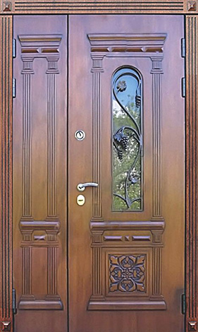 Дизайнерская входная дверь в частный дом с отделкой под дерево и решеткой №17